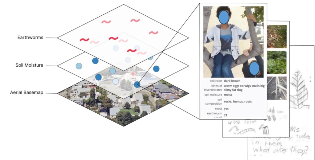 Over the last two decades, there has been an increasing focus on spatial technologies in teaching and learning, revealing the potential to support new forms of youth sensemaking across varied settings and modalities. Recent scholarship has shown the possibilities of participatory digital mapping technologies, enabling young people to collect data within community settings and create interactive data-rich maps about complex phenomena and processes that build from their local expertise and inquiries. Yet to date, these technologies and related pedagogies remain less researched within K-5 educational contexts. In this article, we examine the most recent iteration from a multi-year design research project that centered 5th grade students’ learning about socio-ecological systems by engaging in participatory digital mapping to study their schoolyard soil ecosystems underfoot. We examine the possibilities of centering digital participatory map making as a basis for modeling and argumentation in elementary science. Analyzing whole class discussion video within the 10-week curriculum, we show how children authored their collective maps in numerous ways, making visible their social and ecological knowledge of the schoolyard, as well as their experiences defining, producing and visualizing qualitative and quantitative data. As part of this broader design-based research project, we find that children were able to reason about complex socio-ecological systems across spatial, temporal, and relational dimensions in inventive ways, often considered out of reach for elementary aged students, while also expanding what could count as data and what ways of knowing were valued within the science classroom. Implications for science education, place-based education, and emerging geospatial technologies are discussed.